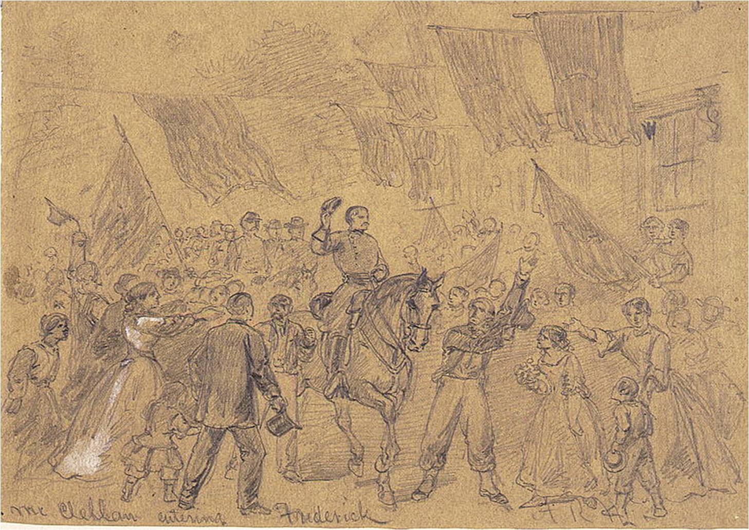 Continuing their arduous march on September 13th, through stifling heat and choking dust, Spangler and the rest of the 130th, “…crossed a commanding range of hills… We beheld the church-spired city of Frederick and the broad, fertile and opulent valley of the Monocacy, shut in by low mountains of surpassing grace and outline, with all nature abloom, – a scene in the fierce sunlight of enchanting beauty.” Once in the city, Spangler experienced a heart warming welcome from throngs of happy citizens. Upon entering the city, “…with full brigades with all the pomp of war and past the Army Commander [McClellan] and glittering staff, the streets resounding with applause, amounted to an ovation. The stars and stripes…were now unfurled and floated to the breeze. Ladies, dressed in their best, waved their handkerchiefs and flags. The populace cheered to the echo, tokens of a most cordial welcome, and supplied water and refreshments to the thirsty and hungry men. Their smiles and tears of gratitude and joy, attested their loyalty to the Union in no uncertain degree.” Such a reception was a rare occurrence, especially for Union army veterans who were more accustom to the shuttered windows, jeers, and cold shoulders received while marching through towns in the South. The patriotic display did much to raise the hearts of soldiers, whether veteran or untested, as in the case of the 130th.