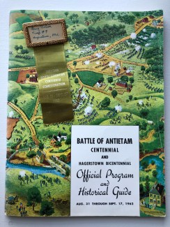 As a young Boy Scout, I had enthusiastically participated in the Centennial Celebration lasting from August 31 to September 17, 1962. It would be the last reenactment to take place on the battlefield. Last spring, I was going through a box of boyhood trinkets in the attic and found the concessions badge that I was required to wear while passing out Official Programs at the Dunker Church and later found an original copy of that program through a dealer in Gettysburg.